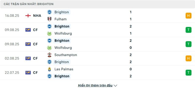 5 trận gần nhất của Brighton & Hove Albion: D-W-W-D-W