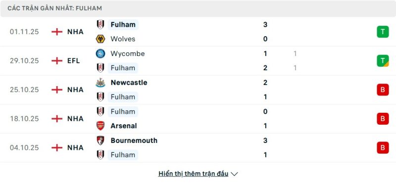 5 trận gần nhất của Fulham: W-D-L-L-L