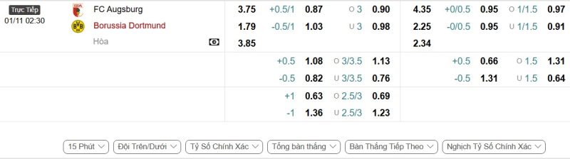 Bảng Tỷ lệ kèo bóng đá FC Augsburg vs Borussia Dortmund