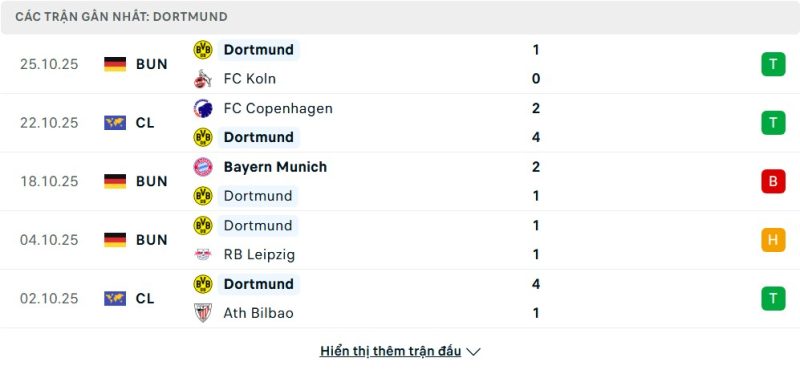 5 trận gần nhất của Borussia Dortmund: W-W-L-D-W