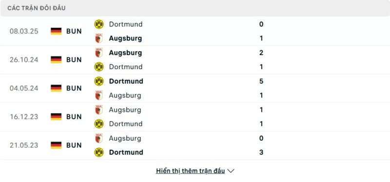 Thành tích đối đầu của FC Augsburg vs Borussia Dortmund