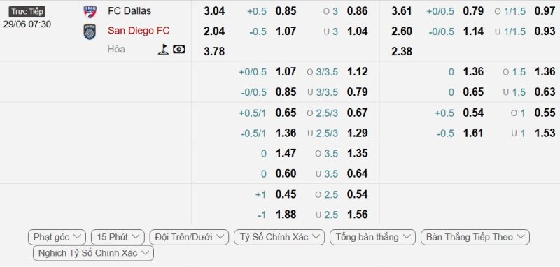 Bảng Tỷ lệ kèo bóng đá FC Dallas vs San Diego FC