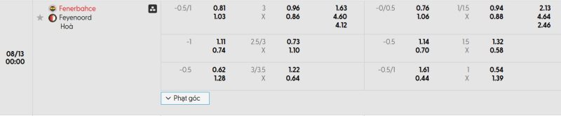 Bảng Tỷ lệ kèo bóng đá Fenerbahçe vs Feyenoord