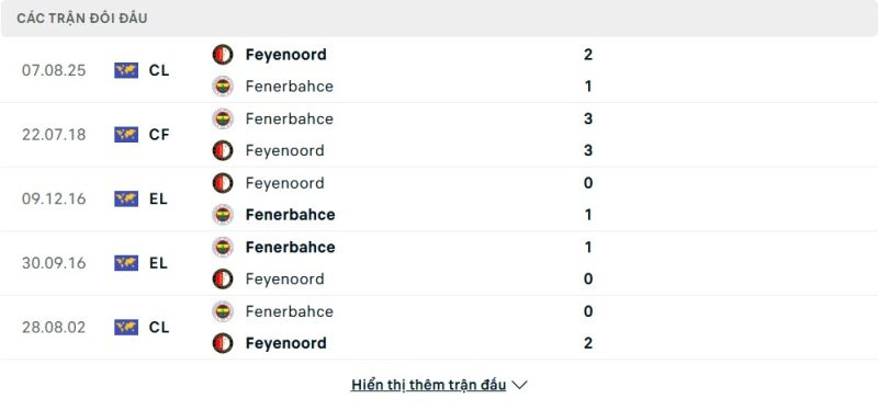 Thành tích đối đầu của Fenerbahçe vs Feyenoord