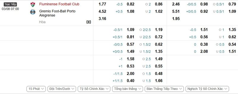 Bảng Tỷ lệ kèo bóng đá Fluminense vs Grêmio