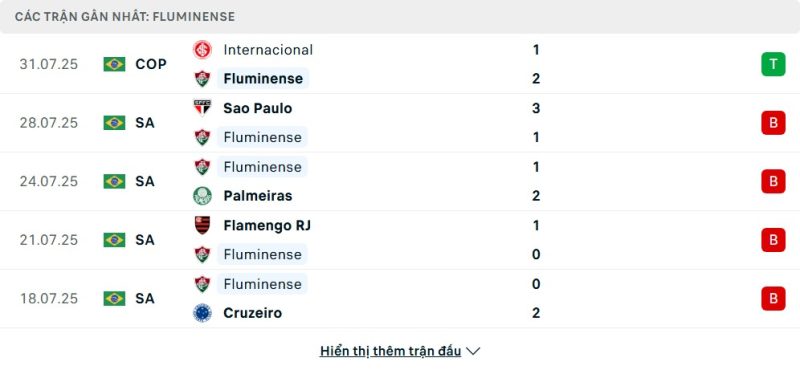 Phong độ gần đây của Fluminense khá thất thường. Đội bóng này hiện đứng thứ 12 trên bảng xếp hạng với 20 điểm sau 15 trận. 5 trận gần nhất trên mọi đấu trường, Fluminense chỉ có 1 chiến thắng, 1 trận hòa và để thua 3 trận. Đáng chú ý, họ vừa có một chiến thắng 2-1 trước Internacional, nhưng trước đó lại có chuỗi trận không mấy thành công. Các kết quả này cho thấy Fluminense vẫn đang tìm lại sự ổn định cần thiết.