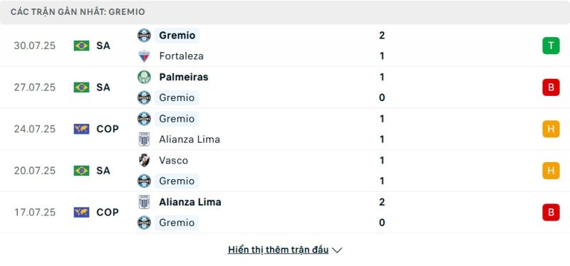 5 trận gần nhất của Grêmio: W-L-D-D-L