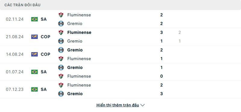 Thành tích đối đầu của Fluminense vs Grêmio