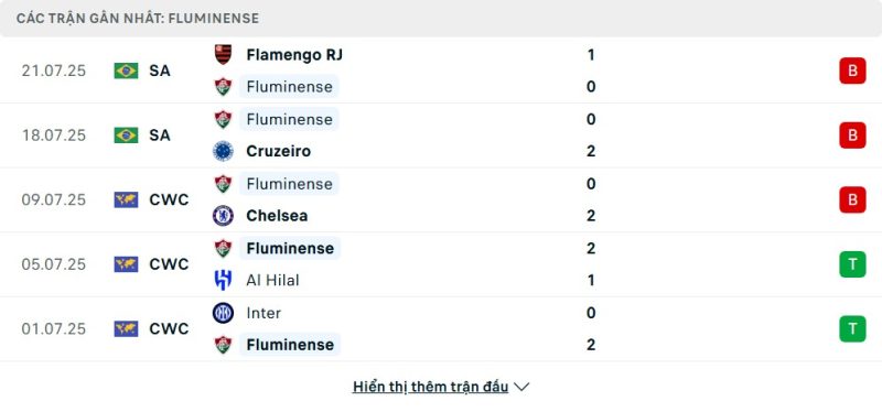 5 trận gần nhất của Fluminense: L-L-L-W-W