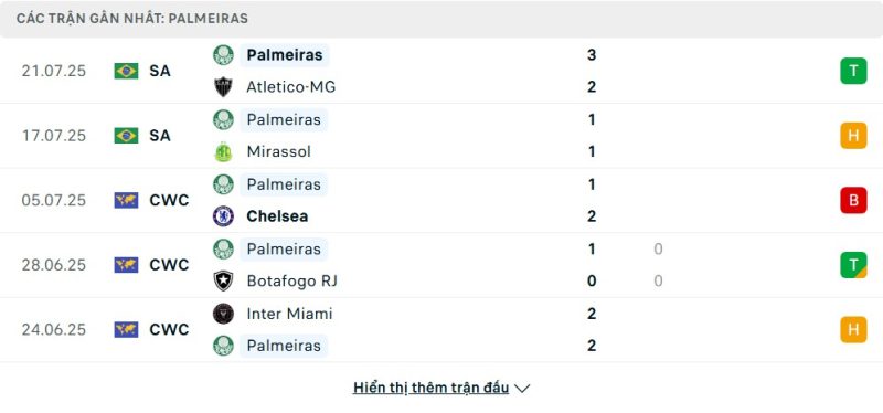 5 trận gần nhất của Palmeiras: W-D-L-D-D