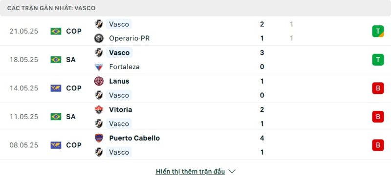 5 trận gần nhất của Vasco da Gama: D-W-L-L-L