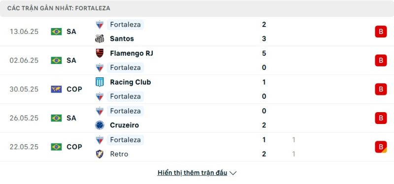 Thống kê phong độ gần đây Fortaleza vs Ceará