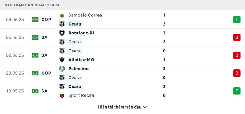 5 trận gần nhất của Ceará: W-L-L-L-W