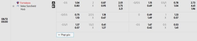 Bảng Tỷ lệ kèo bóng đá Fortaleza vs Vélez Sarsfield