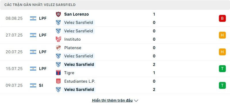 5 trận gần nhất của Vélez Sarsfield: L-D-D-W-W