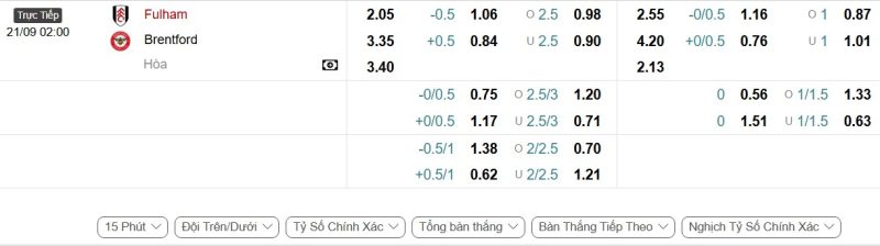 Bảng Tỷ lệ kèo bóng đá Fulham vs Brentford