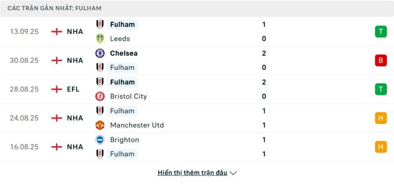5 trận gần nhất của Fulham: W-L-W-D-D