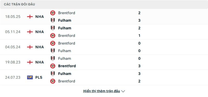 Thành tích đối đầu của Fulham vs Brentford