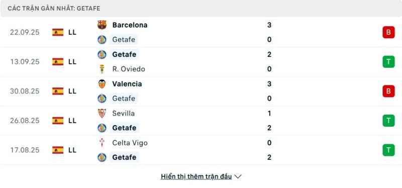 5 trận gần nhất của Getafe: L-W-L-W-W