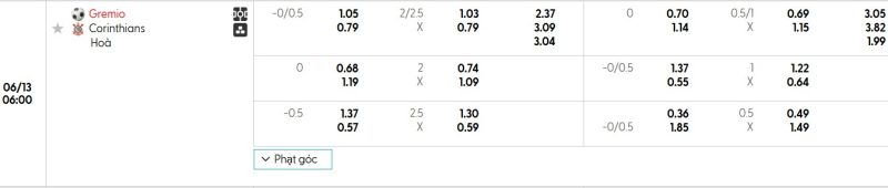 Bảng Tỷ lệ kèo bóng đá Grêmio vs Corinthians