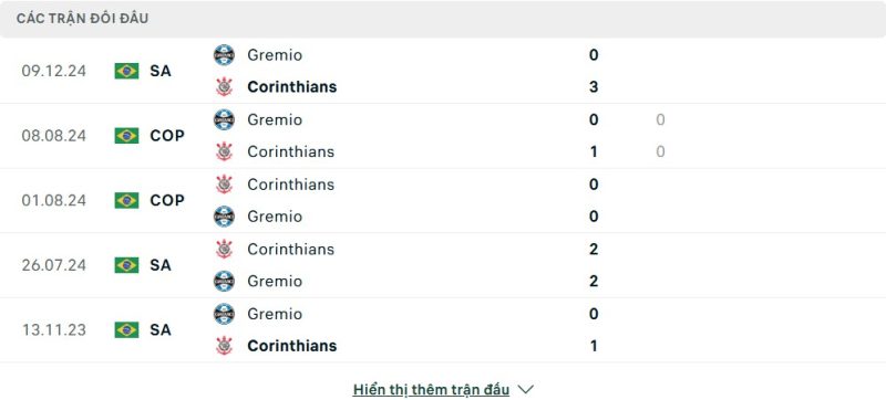 Thành tích đối đầu của Grêmio vs Corinthians