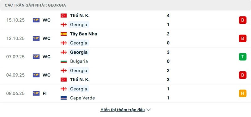5 trận gần nhất của Gruzia: L-L-W-L-D