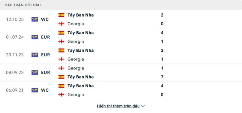 Thành tích đối đầu của Gruzia vs Tây Ban Nha