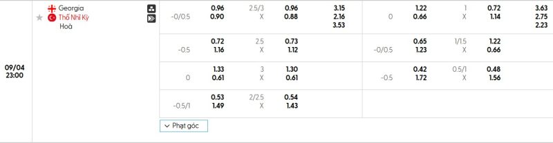 Bảng Tỷ lệ kèo bóng đá Gruzia vs Thổ Nhĩ Kỳ