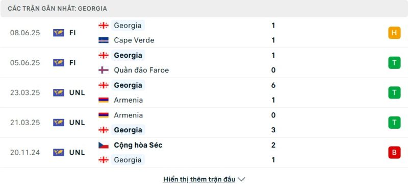 5 trận gần nhất của Gruzia: D-W-W-W-L