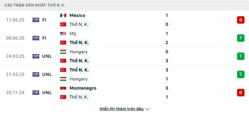 5 trận gần nhất của Thổ Nhĩ Kỳ: L-W-W-W-L