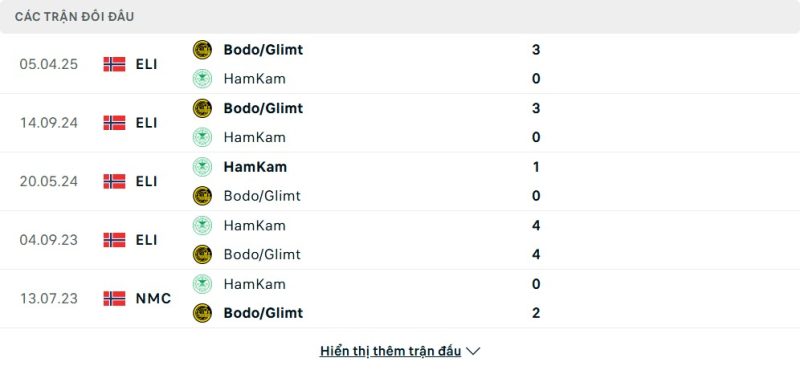 Thành tích đối đầu của HamKam vs Bodø/Glimt