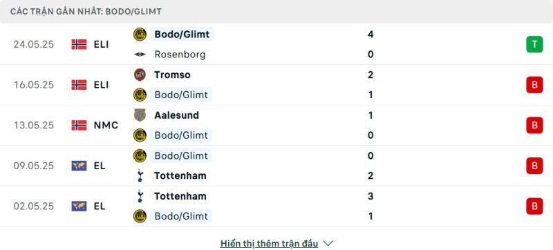 5 trận gần nhất của Bodø/Glimt: W-L-L-L-L