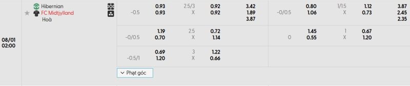 - Kèo tỷ số bóng đá hiệp 1: Hibernian 0-2 Midtjylland