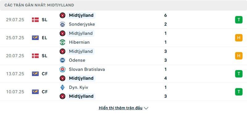 Bên kia chiến tuyến, Midtjylland đang duy trì được mạch phong độ ổn định. Họ vừa giành chiến thắng tưng bừng 6-2 trước Sonderjyske tại giải quốc nội, nối dài chuỗi trận bất bại lên con số 5 với 3 thắng, 2 hòa. Các trận đấu gần đây cho thấy đội bóng Đan Mạch có khả năng ghi bàn khá đều và ổn định, trong đó có các kết quả đáng chú ý như thắng Dynamo Kyiv 3-1 hay Slovan Bratislava 4-1. Với đà tâm lý tốt, Midtjylland hành quân đến Scotland với sự tự tin lớn.