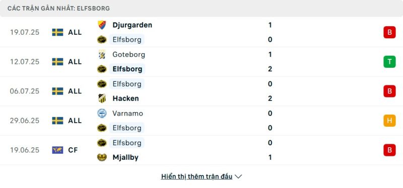 5 trận gần nhất của IF Elfsborg: L-W-L-D-L