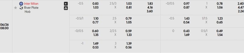 Bảng Tỷ lệ kèo bóng đá Inter Milan vs River Plate