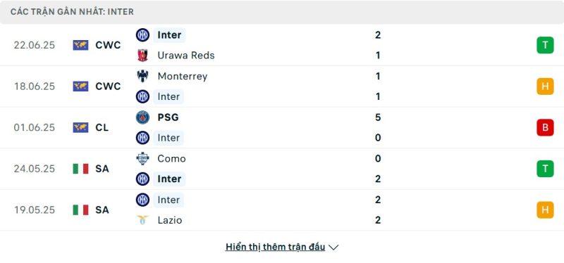 5 trận gần nhất của Inter Milan: W-D-L-W-D