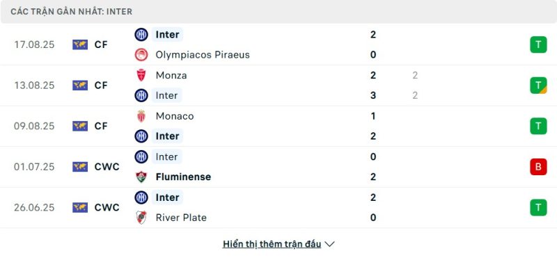 5 trận gần nhất của Inter Milan: W-D-W-L-W