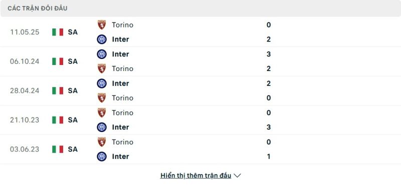 Thống kê phong độ gần đây Inter Milan vs Torino