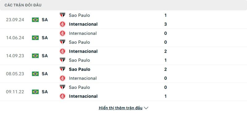 Thống kê phong độ gần đây Internacional vs São Paulo