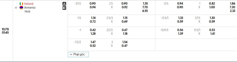 Bảng Tỷ lệ kèo bóng đá Ireland vs Armenia