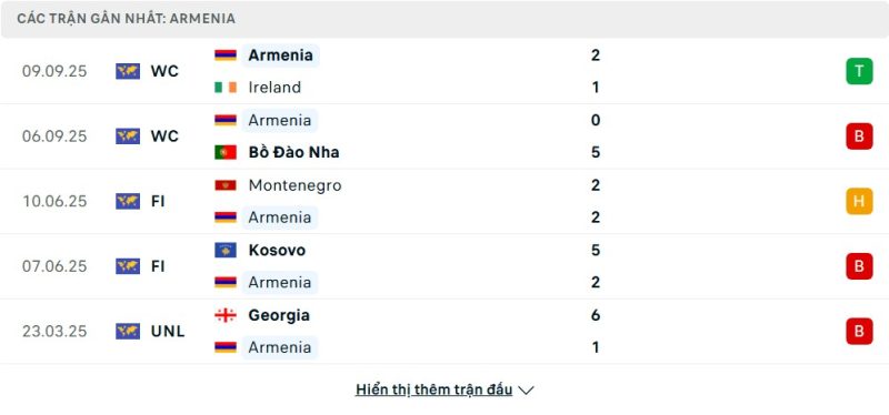 5 trận gần nhất của Armenia: W-L-D-L-L