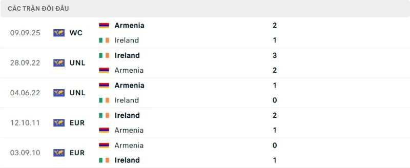 Thành tích đối đầu của Ireland vs Armenia