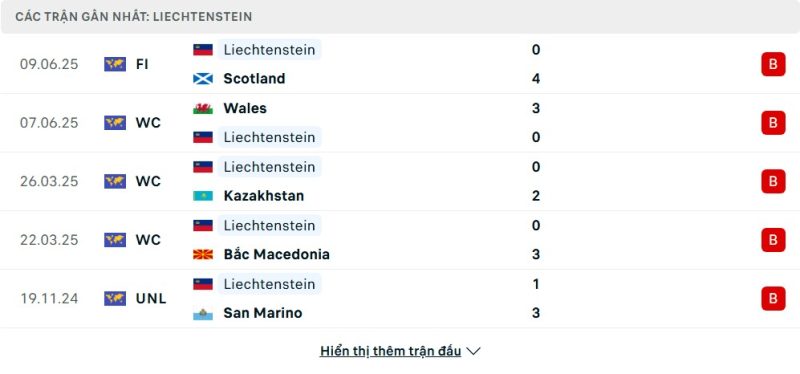 5 trận gần nhất của Liechtenstein: L-L-L-L-L