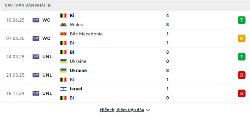 5 trận gần nhất của Bỉ: W-D-W-L-L