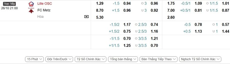 Bảng Tỷ lệ kèo bóng đá Lille vs Metz