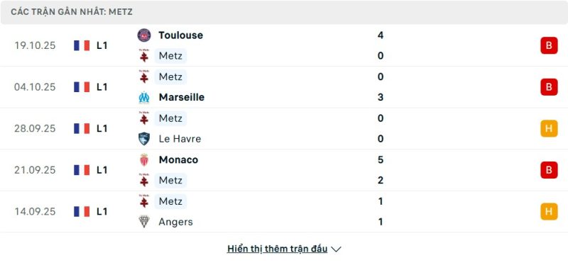 5 trận gần nhất của Metz: L-L-D-L-D