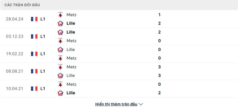Thành tích đối đầu của Lille vs Metz