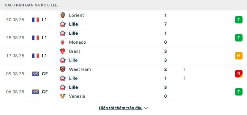 Lille đang cho thấy khởi đầu khá ấn tượng tại Ligue 1 mùa này. Sau ba vòng đấu, họ có được hai chiến thắng cùng một trận hòa, đứng ở vị trí thứ ba trên bảng xếp hạng với 7 điểm. Đáng chú ý, Lille đã có màn vùi dập Lorient với chiến thắng đậm, qua đó chứng minh sức mạnh hàng công bùng nổ. Ngoài ra, chiến thắng trước AS Monaco càng giúp đội bóng củng cố sự tự tin. Với chuỗi kết quả ổn định cùng hiệu số bàn thắng bại vượt trội, Lille đang trở thành một trong những ứng viên sáng giá cho cuộc đua đầu bảng ở mùa giải năm nay.