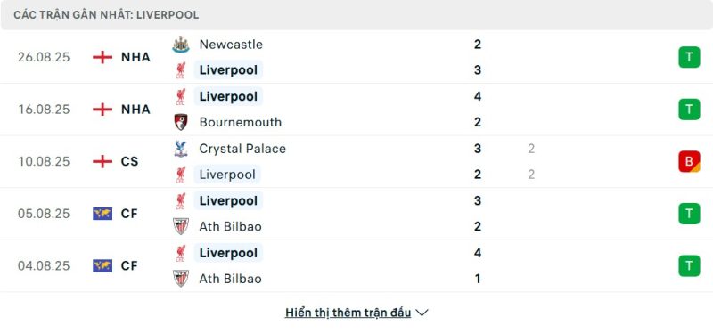5 trận gần nhất của Liverpool: W-W-D-W-W